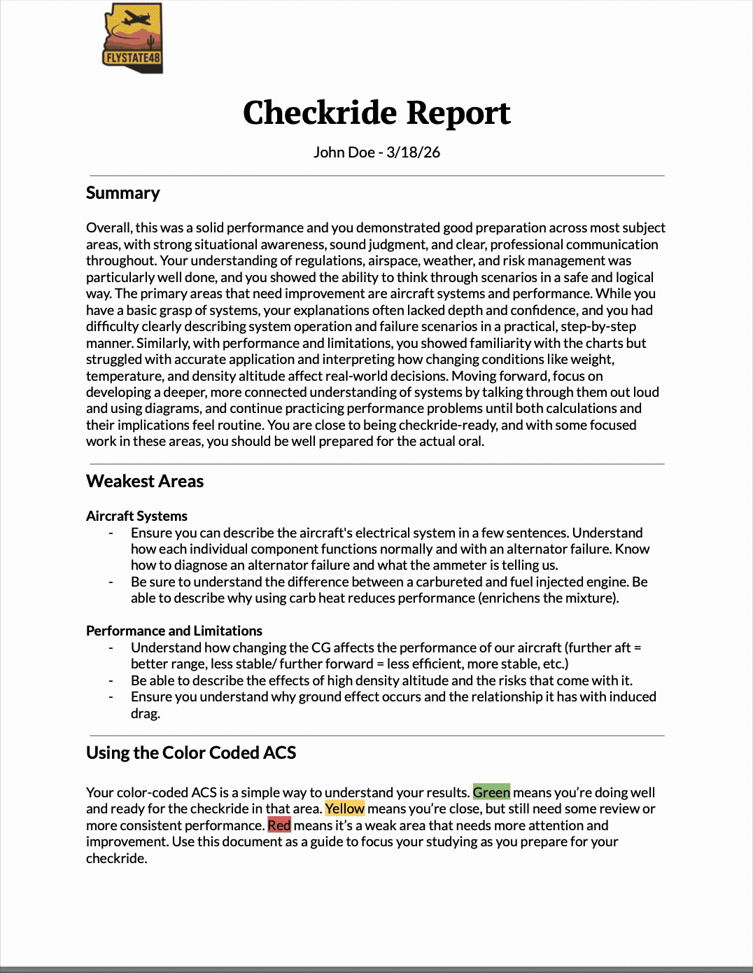 Schedule a mock checkride designed to simulate the real exam and identify your weak areas. Each session follows the ACS with realistic questions DPEs are asking today. You’ll leave with a detailed, annotated report outlining your strengths and exactly what to focus on before test day.